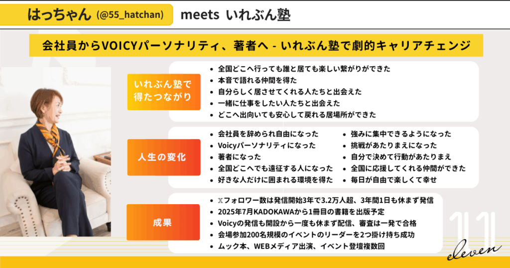 いれぶん塾には、こんなにも多くの仲間が、新しい一歩を踏み出し、結果を出しています。